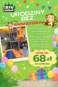 - Animator w stroju małpki – nasza sympatyczna małpka co jakiś czas odwiedza salę, witając dzieci i bawiąc się z nimi